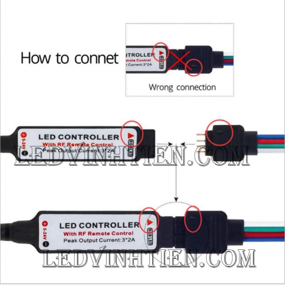 Hình ảnh chi tiết bộ điều khiển led 5V dùng cho 2 cuộn led và cách hướng dẫn cách đấu nối, cài đặt dây led với bộ điều khiển