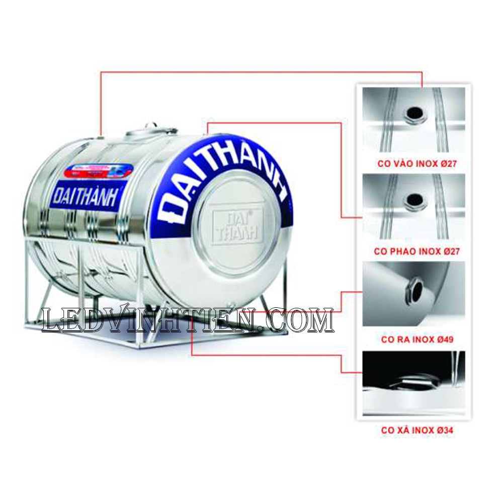 - Bồn nước inox Đại Thành 2000 lít ngang được thiết kế sẵn các co nước vào, co nước ra, co gắn phao và co nước xả cặn. Các co nước có thể khoan lớn hơn hoặc nhỏ hơn theo nhu cầu sử dụng.
