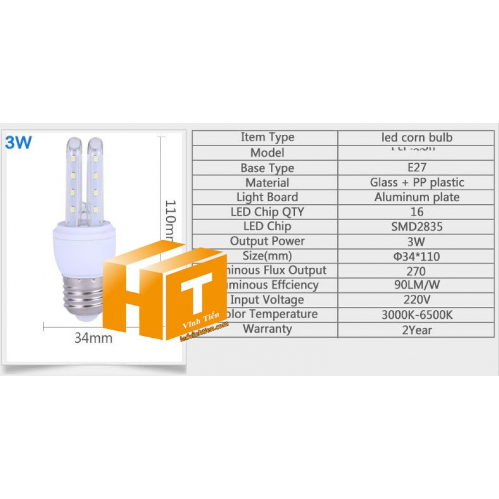 Thông số kỹ thuật Bóng đèn U led 3W loại tốt, giá rẻ, chất lượng, siêu sáng