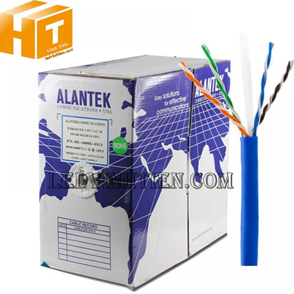 • Cáp mạng Cáp xoắn đôi Alantek CAT5E được thiết kế để hỗ trợ ứng dụng băng thông cao lên đến 1 Gigabit Ethernet. Cáp được bao gồm các ruột đồng rắn 24AWG trần được cách điện với lớp cách điện Polyethylene mật độ cao (HDPE) (1,03mm). Đối với cáp có vỏ bọc, các ruột dẫn cách điện được xoắn thành từng cặp và được hoàn thiện với Áo khoác bên ngoài, một lớp bổ sung của Lá nhôm nhiều lớp bao phủ 4 cặp xoắn của dây dẫn cách điện.
