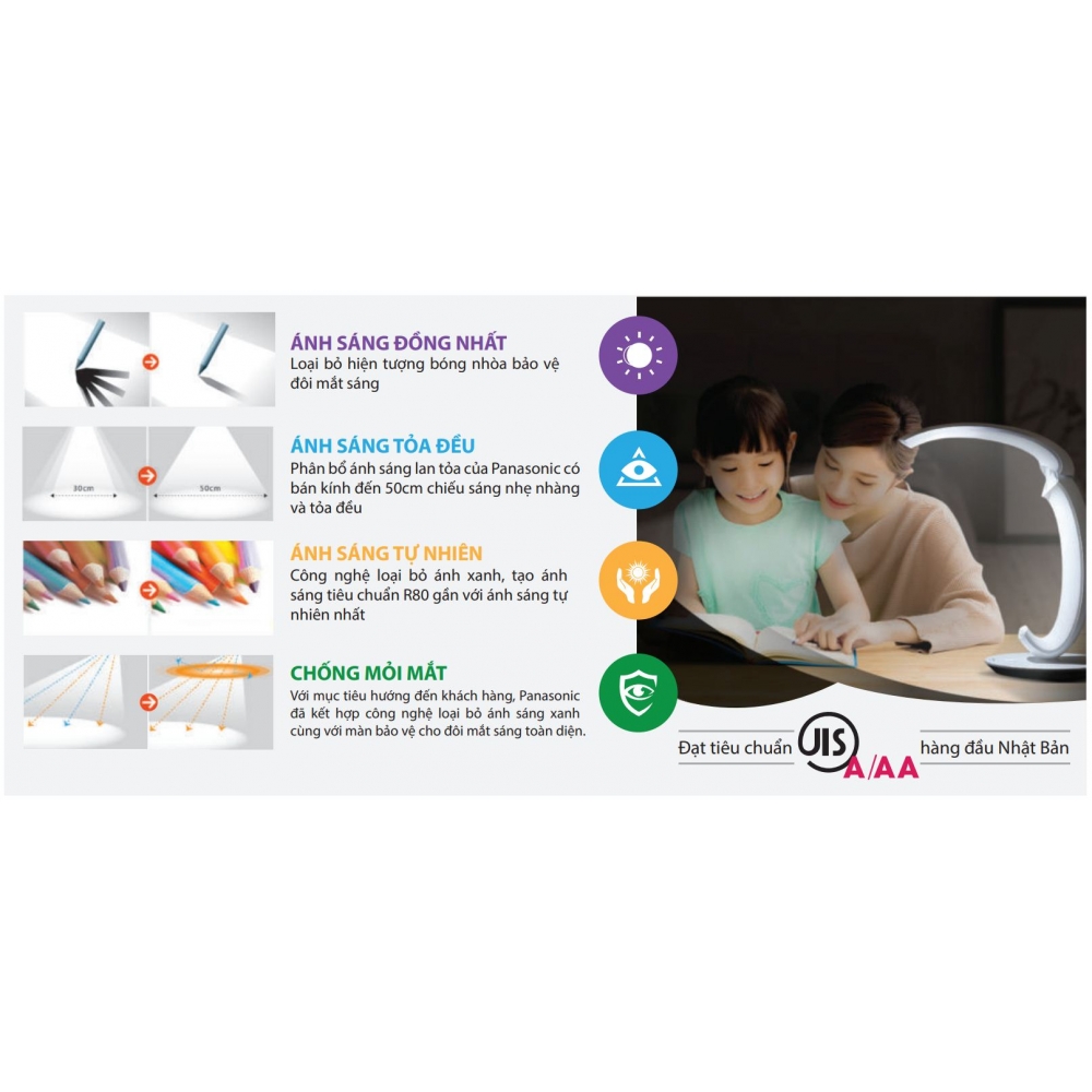 JIS A/AA là tiêu chuẩn hàng đầu Nhật Bản với sự kết hợp gồm nhiều yếu tố về độ sáng tiêu chuẩn, phân bổ ánh sáng tỏa đều, màu sắc chân thực và chống bức xạ mắt. Tạo điều kiện ánh sáng lý tưởng cho mắt tập trung học tập và làm việc.