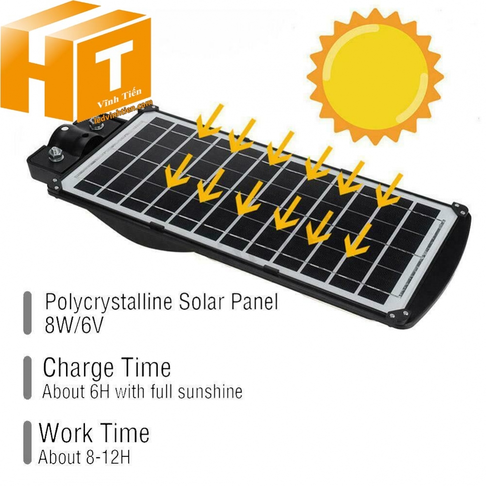 - Pin chất lượng cao: Pin lithium iron phosphate có tuổi thọ dài, dòng điện ổn định và dòng xả liên tục. Sau khi sạc 6-8 giờ dưới ánh sáng mặt trời đầy đủ, thời gian làm việc lên tới 10-12H giờ ở chế độ sáng đầy đủ và hơn 20 giờ ở chế độ sáng một nữa và có thể được sử dụng liên tục trong 3-4 ngày trong những ngày mưa.