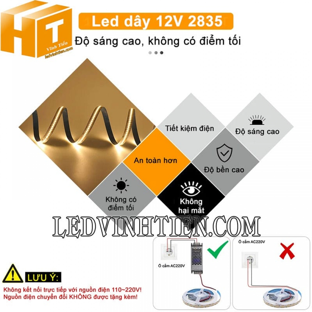 Tính năng đèn led dây 2835 12V ánh sáng vàng nắng