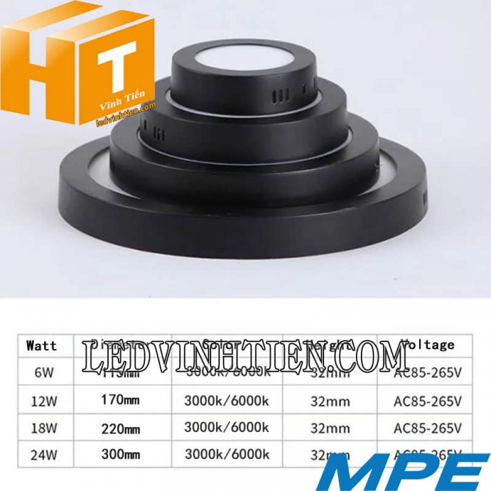 I. Thông số kỹ thuật của đèn led panel ốp trần nổi tròn viền đen 3 màu SRPLB-12W chính hãng MPE.