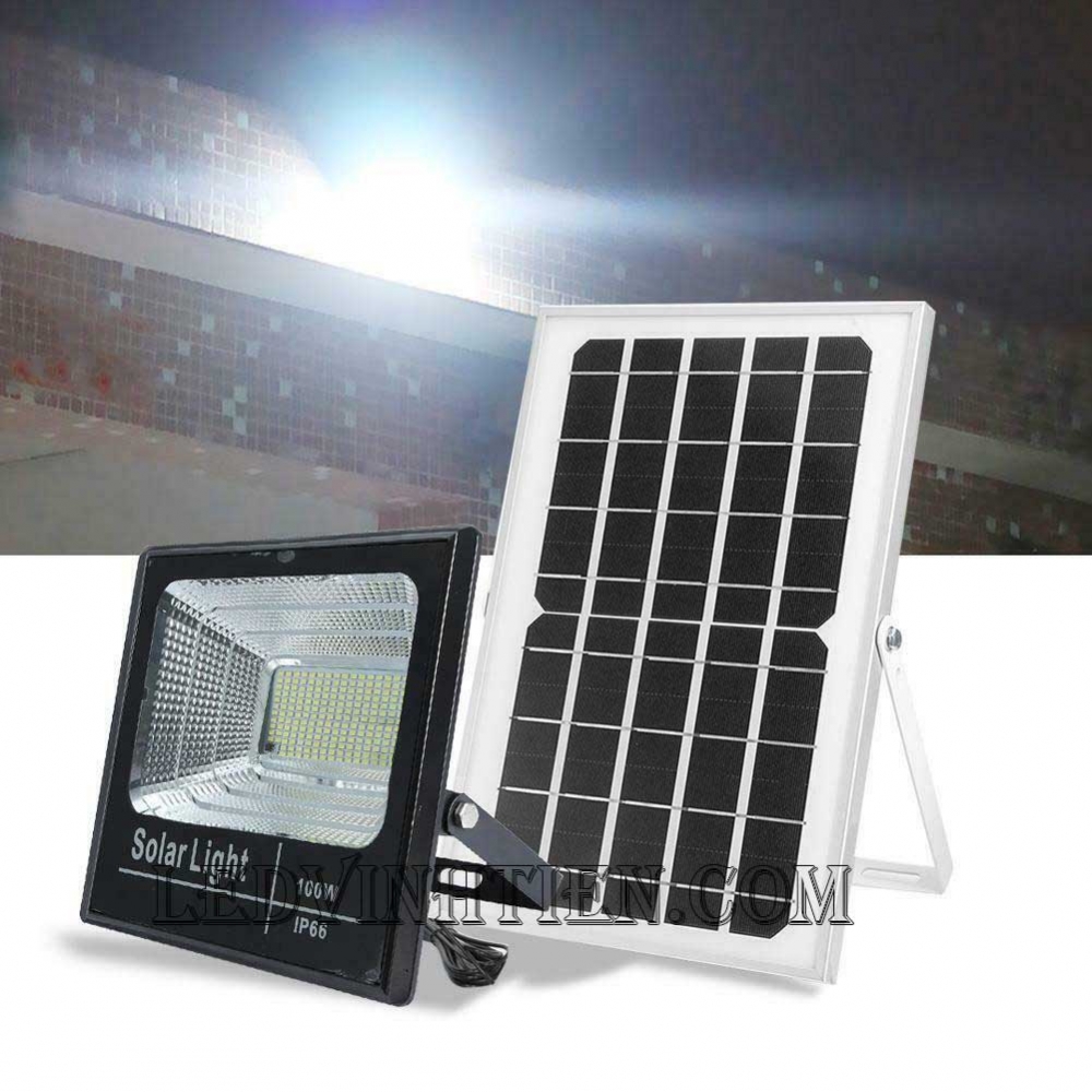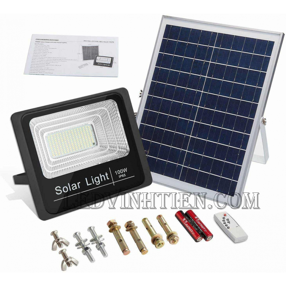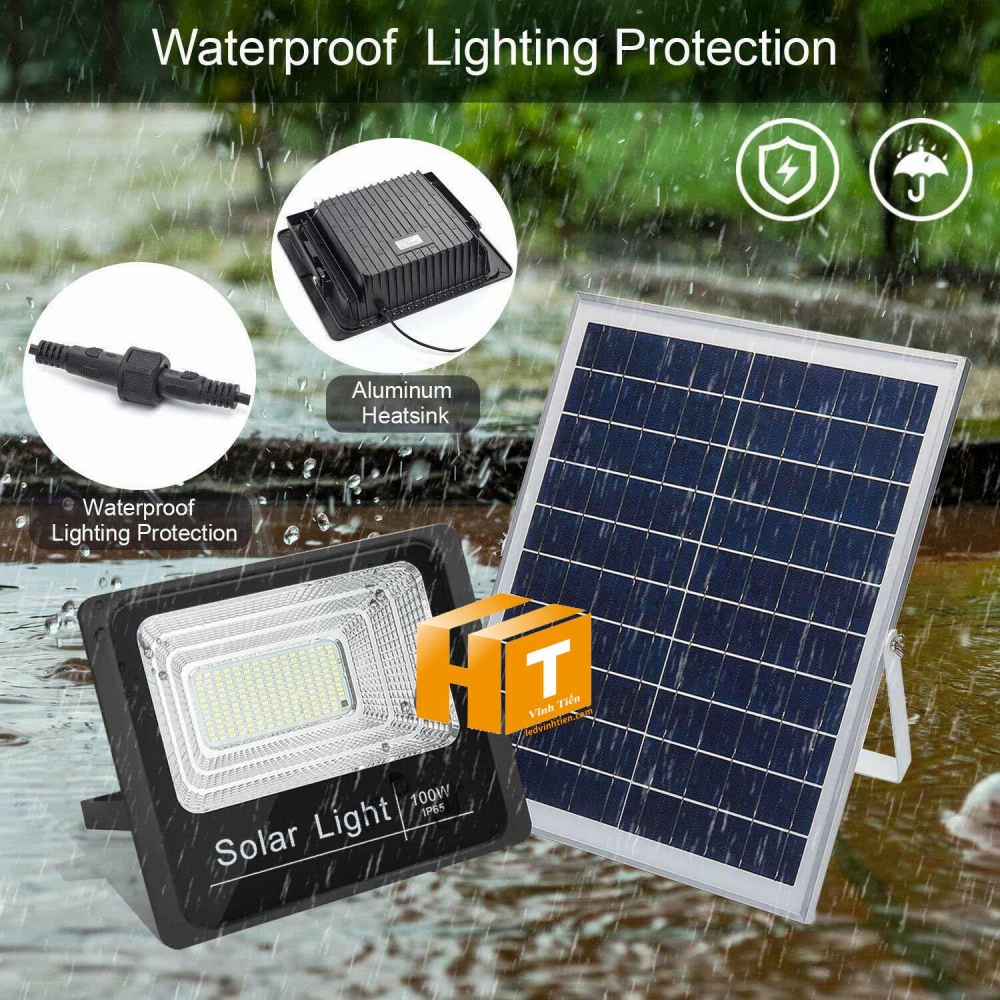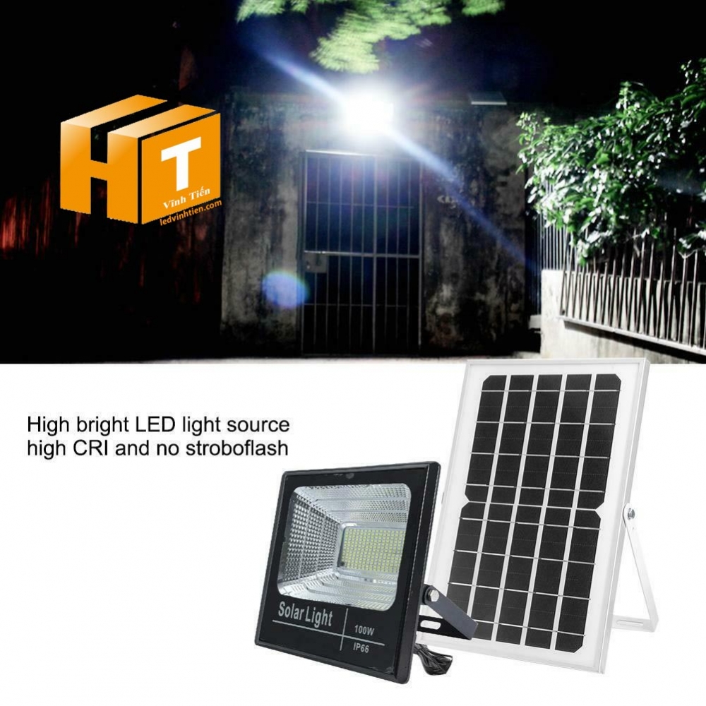 Đèn pha năng lượng mặt trời 100W (Đèn pha led năng lượng mặt trời 100W VTHT-NLMT006). sử dụng năng lượng mặt trời chiếu sáng từ 3-5 năm không lo tốn tiền điện,  hiêu JINDIAN, Thời gian chiếu sáng đến 10-12 giờ liên tục,  Đèn có tính năng tự động bật khi trời tối và tắt khi trời sáng.  Lắp đặt dễ dàng, phù hợp mọi địa hình,  Thắp sáng suốt đêm, tránh xa sự dòm ngó của trộm cắp  Kèm theo điều khiển bật/tắt từ xa và chế độ hằng giờ hiện đại giúp cuộc sống của bạn dễ dàng và tiện lợi hơn bao giờ hết.  Tấm pin công nghệ Poly, tuổi thọ lên đến 10-12 năm. Thích hợp lắp đặt trong nhà, các ki ốt, nhà hàng, trên tàu thuyền. sản phẩm đèn năng lượng dùng ngoài trời, loại tốt, giá rẻ, chất lượng, siêu sáng, cảm úng chuyển động, chính hãng ledvinhtien.com