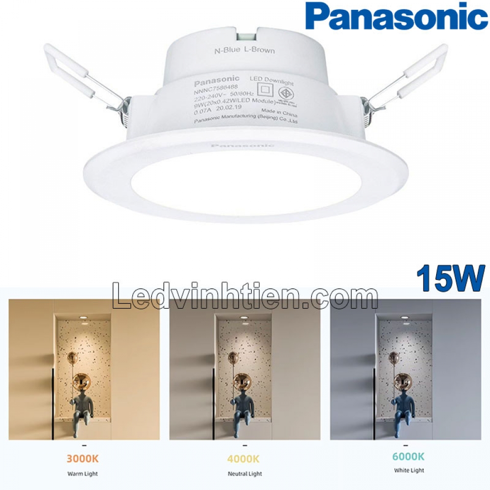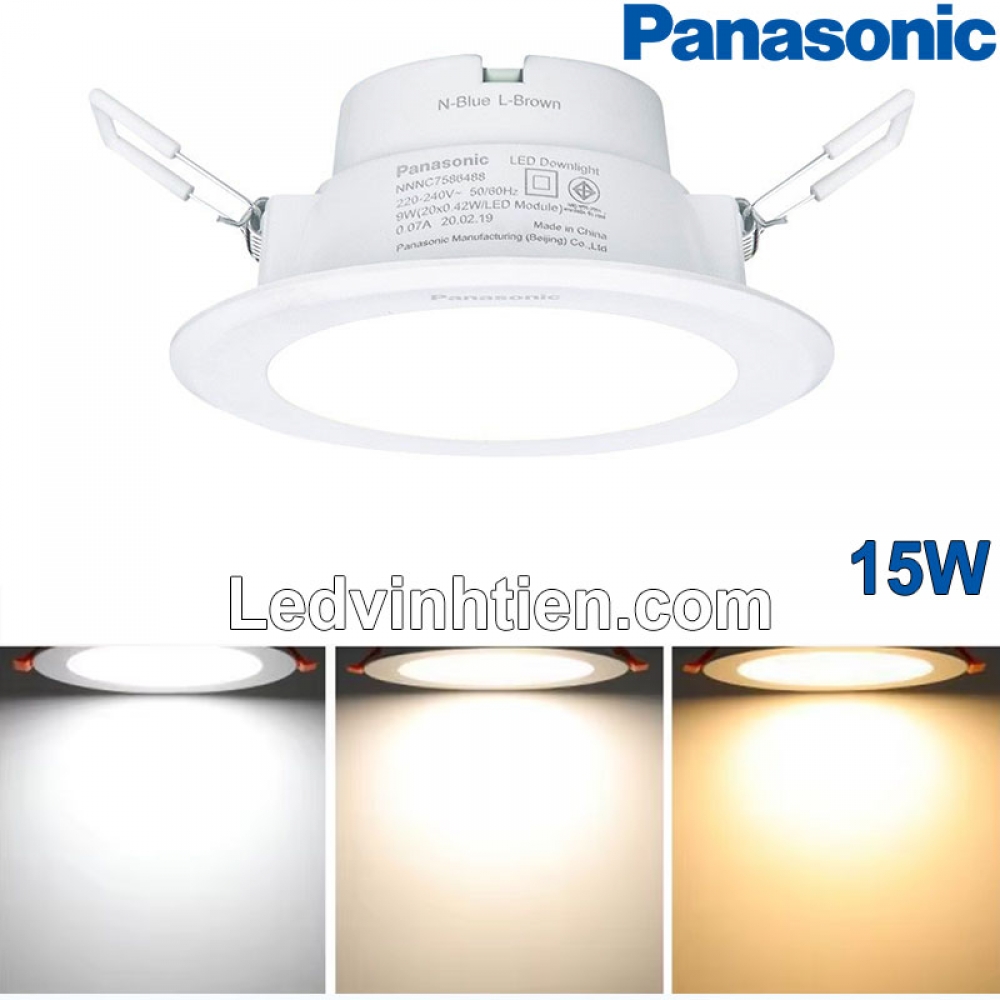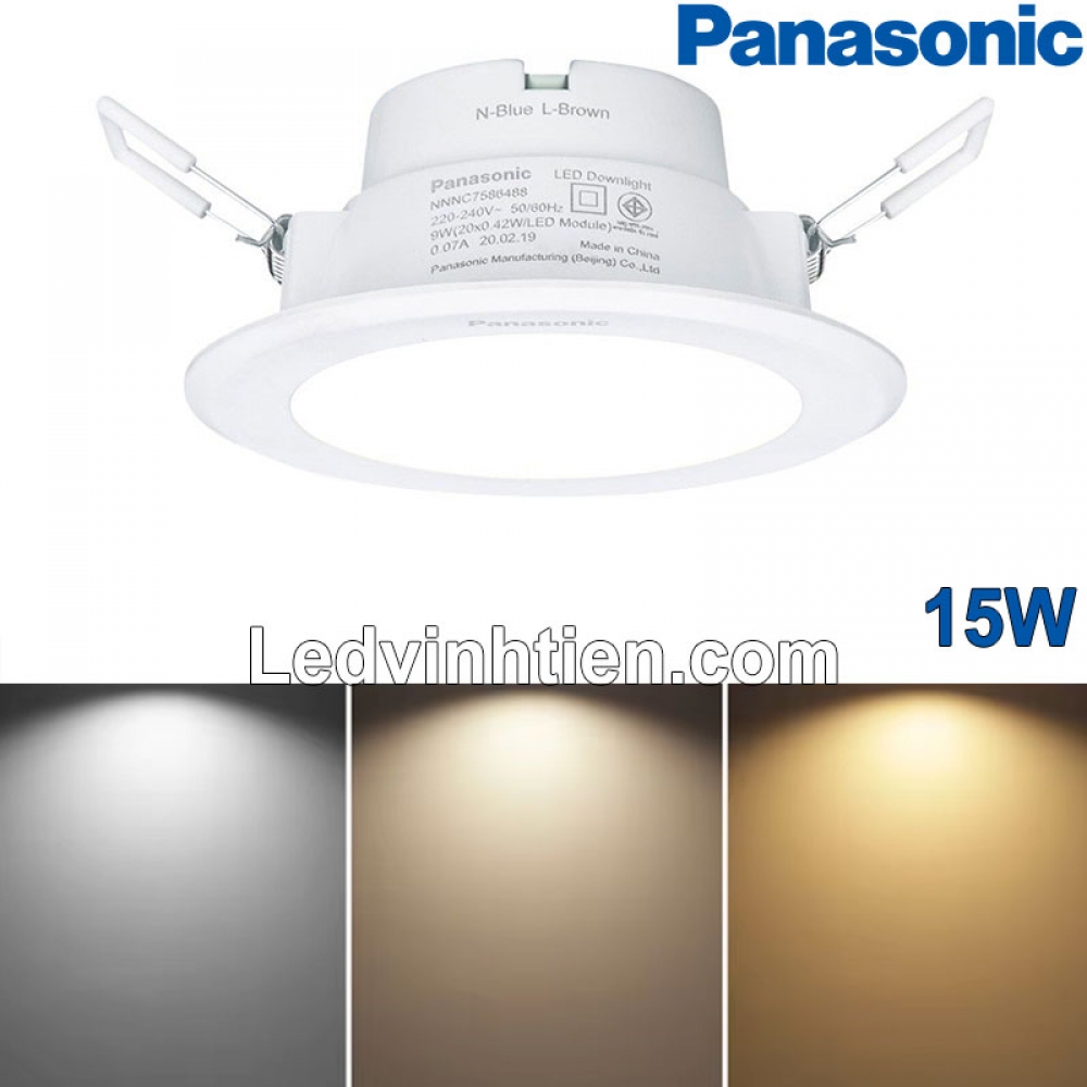 Đèn LED downlight Panasonic 15W với ánh sáng vàng, trắng và trung tính, dễ dàng chuyển đổi màu sắc.