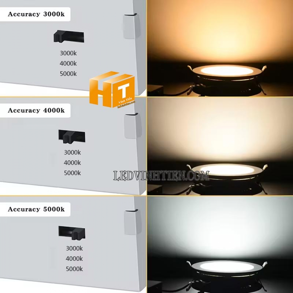 • Nhiệt độ màu (CCT): 6000-6500K/4000-4500K/2800-3200K. Trắng, trung tính, vàng