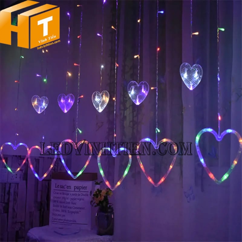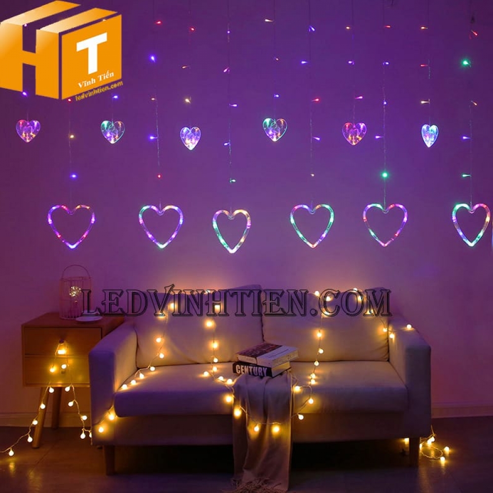 - Đèn rèm led hình trái tim gồm nhiều đèn led nhỏ xen kẻ liền dây với nhau, đứng yên hoặc nhấp nháy luân phiên giúp tô điểm rực rỡ cho tổ ấm của bạn, khiến không gian như bừng lên sức sống. Đặc biệt, đèn led làm bằng nhựa trong suốt bền hơn và sáng hơn, huyền ảo hơn.