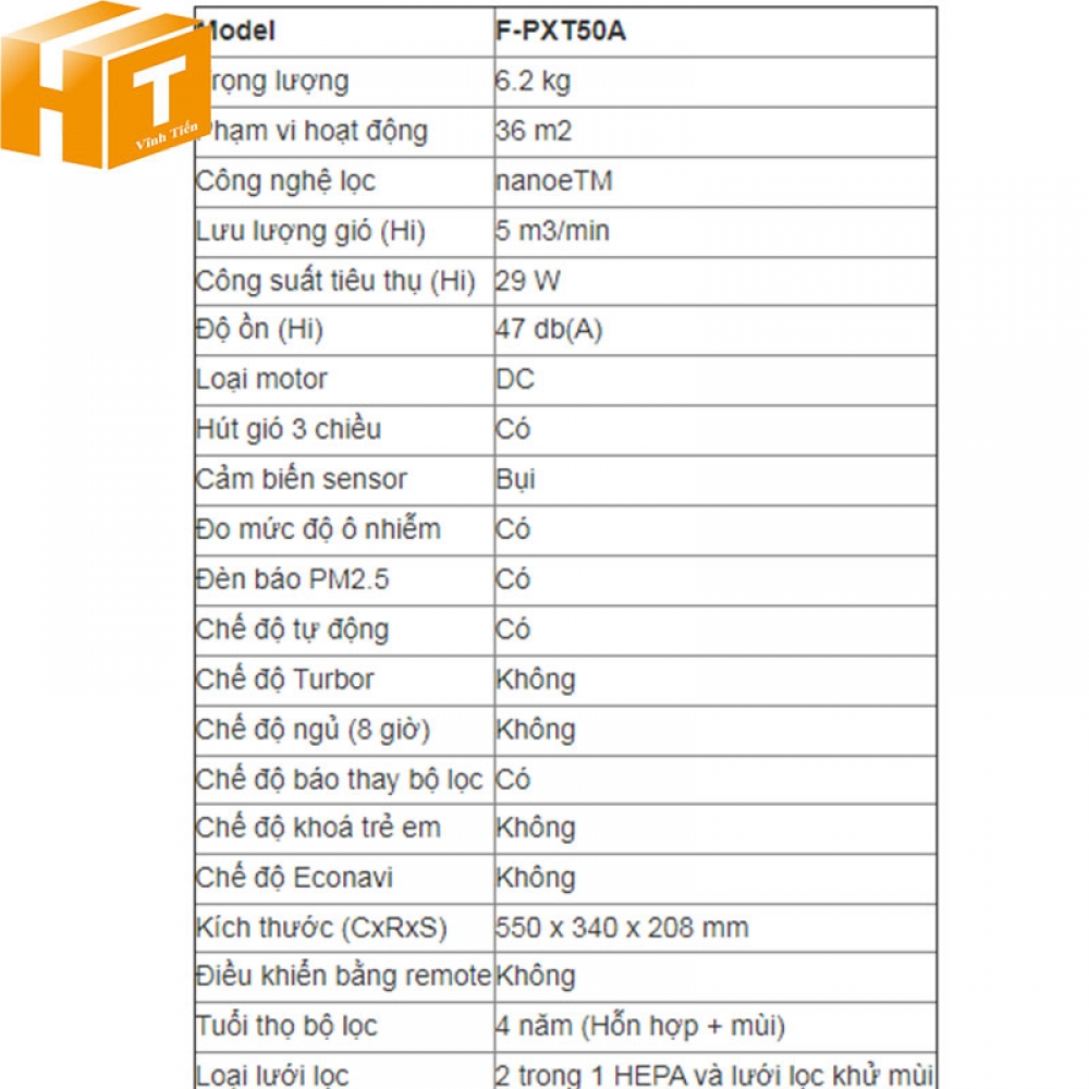 Thông số kỹ thuật của máy lọc không khí F-PXT50A loại tốt, chính hãng Panasonic, chiết khấu cao