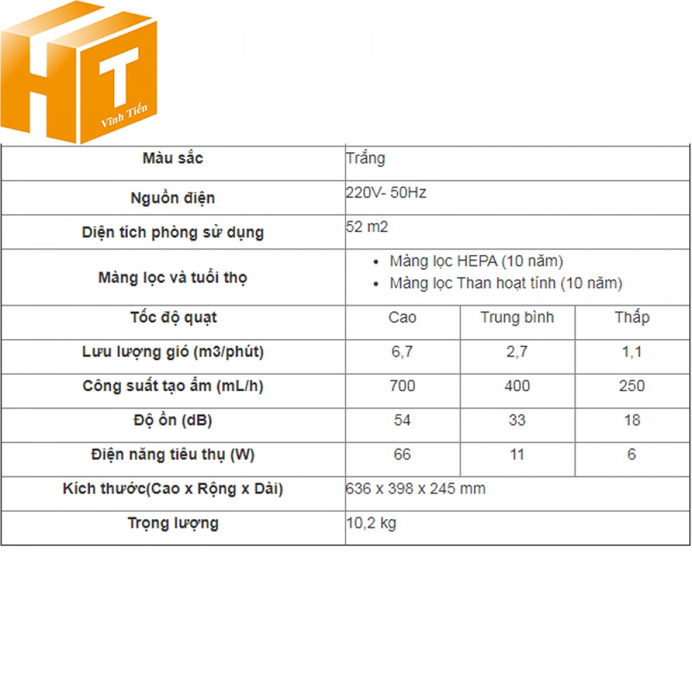 - Loại lưới lọc: HEPA