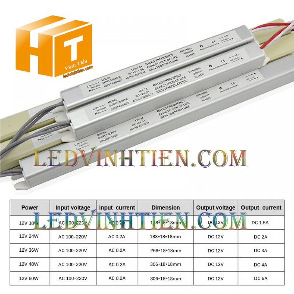 • 12v-60w: 5A đầu vào 180-260v Đầu ra 12v kích thước 312 * 18 * 18mm.