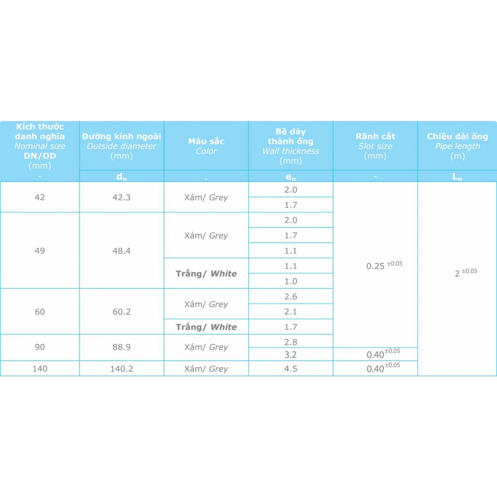 - Ống lọc nhựa uPVC dùng cho khoan giếng, được sản xuất theo tiêu chuẩn TCCS 11:2013/ĐH.