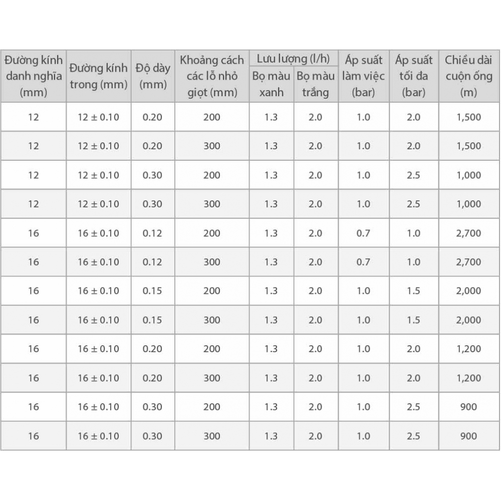Thông số kỹ thuật ống tưới nhỏ giọt PE loại tốt, giá rẻ, chiết khấu cao, chính hãng
