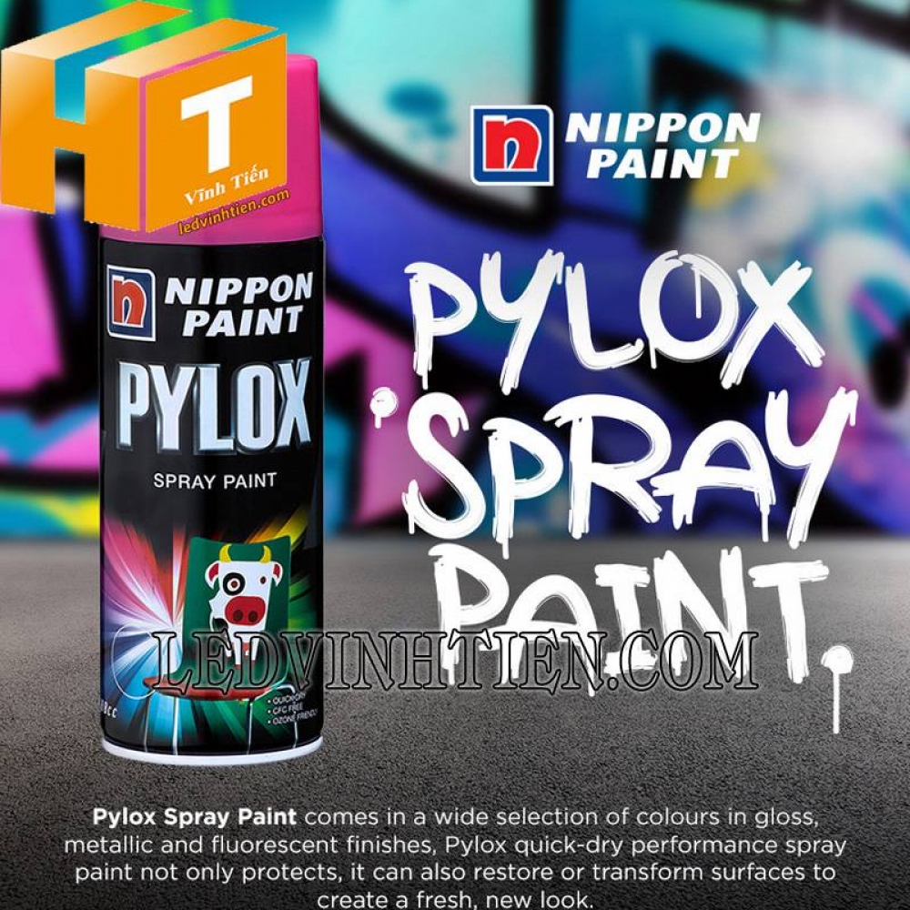 • Sơn xịt Nippon Pylox là loại sơn dầu gốc acrylic & Alkyd-nitro-cellosolve biến tính.